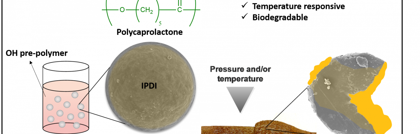 We report on the encapsulation of high loadings of liquid isophorone diisocyanate (IPDI) in biodegradable, temperature responsive poly(ε-caprolactone) (PCL) microcapsules (MCs), aimed to be applied as crosslinking agents for the development of a generation of safer and eco-innovative adhesives, which are one-component and self-reactive. The biodegradable PCL MCs were formed via solvent evaporation method in combination with an oil-in-oil-in-water (O/O/W) double emulsion system. Two PCL grades with different molecular weights (MW) were tested as shell material. The use of PCL with higher MW, for the IPDI encapsulation, resulted in core-shell MCs of diameters ranging from 200 to 700 µm and remarkably high isocyanate loadings, up to 60 wt%. The successful IPDI encapsulation and MCs’ shell composition was revealed by Fourier transformed infrared spectroscopy (FTIR) in combination with thermogravimetric analysis (TGA) and gel permeation chromatography (GPC), while the MCs’ morphology and size distribution were assessed by scanning electron microscopy (SEM) and optical microscopy. Differential scanning calorimetry (DSC) in combination with adhesion proof-of-concept studies showed that the newly developed PCL MCs were able to respond to the external stimuli of temperature and pressure, typically employed during the adhesive application, revealing an effective IPDI release in the adhesive joint. The obtained results confirm the viability for the sustainable engineered MCs to be used as crosslinking agents and, therefore, enablers of eco-innovative high performing adhesives. Finally, it should be stressed that the obtained MCs are potentially useful to provide self-healing capability to materials, and that the developed technology may be used in the encapsulation of a variety of other reactive species by means of a purely physical process, using biodegradable polymers.